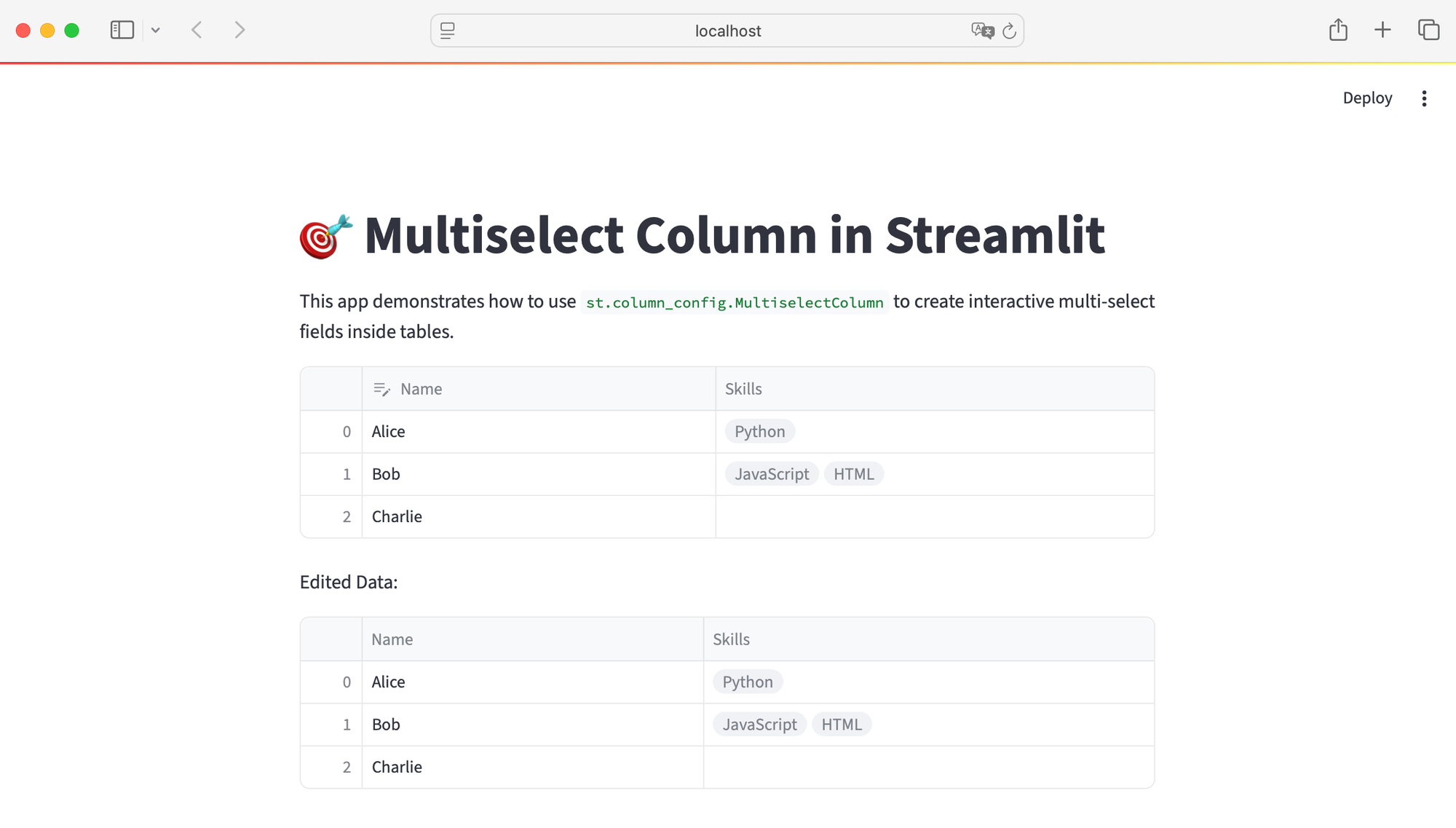st.write("This app demonstrates how to use `st.column_config.MultiselectColumn` to create interactive multi-select fields inside tables.")