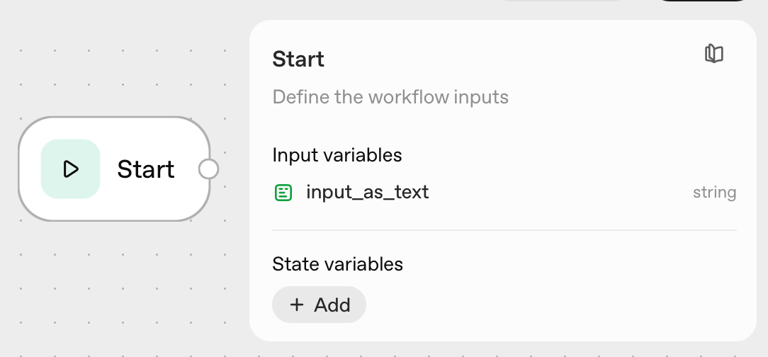 The Start node defines how your workflow receives input. In chat workflows, it does two key things: