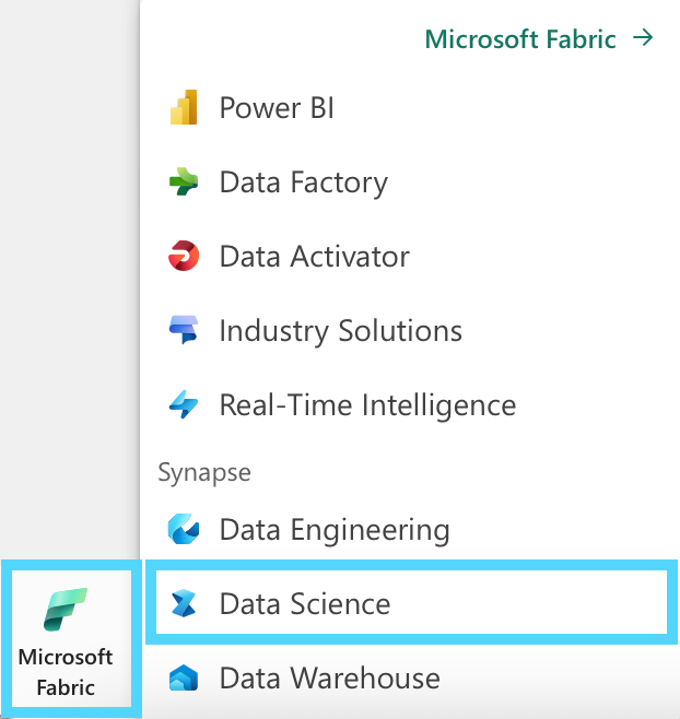 Next, switch to the Data Science experience. To do this, click on the Microsoft Fabric icon on the bottom left and select "Data Science".