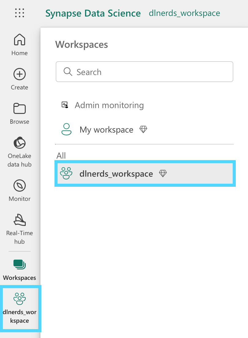 Click on the "Workspaces" tab in the left sidebar and select the desired workspace. In our case, we select the workspace "dlnerds_workspace".
