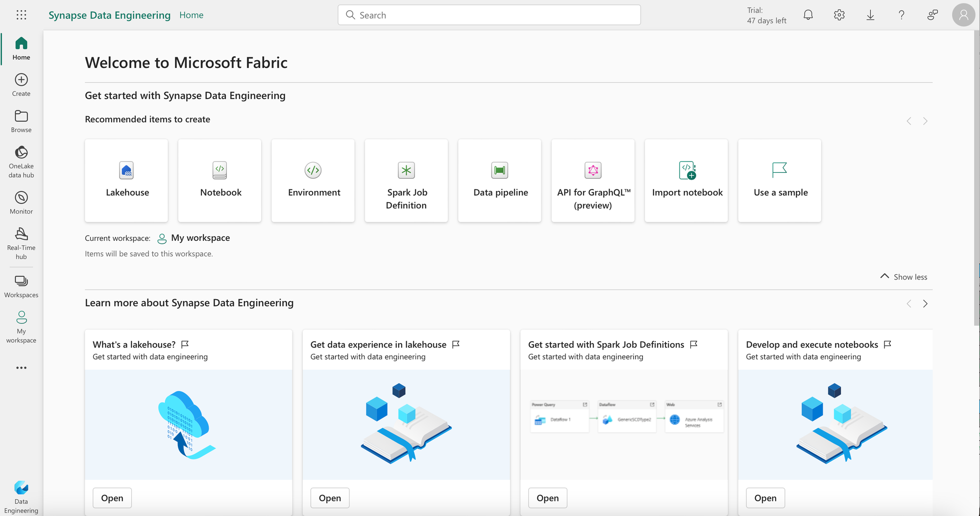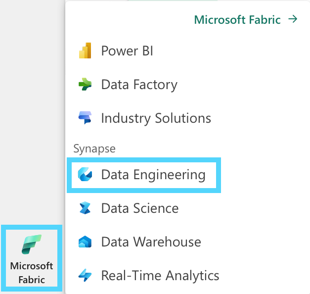 Next, switch to the Data Engineering experience. To do this, click on the Microsoft Fabric icon on the bottom left and select "Data Engineering".