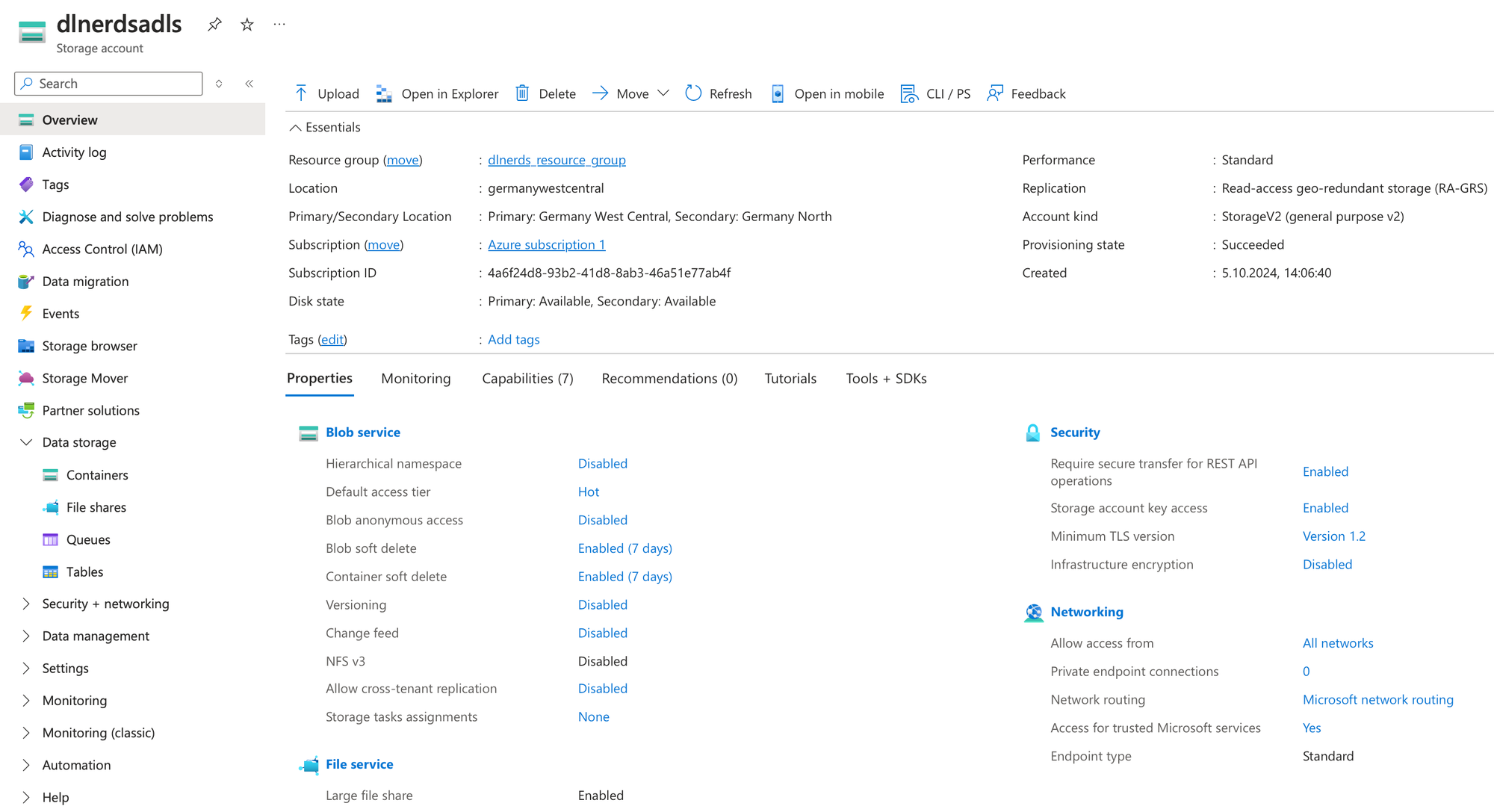 Open an Azure Data Lake Storage (ADLS). In our case we open the ADLS named dlnerdsadls.