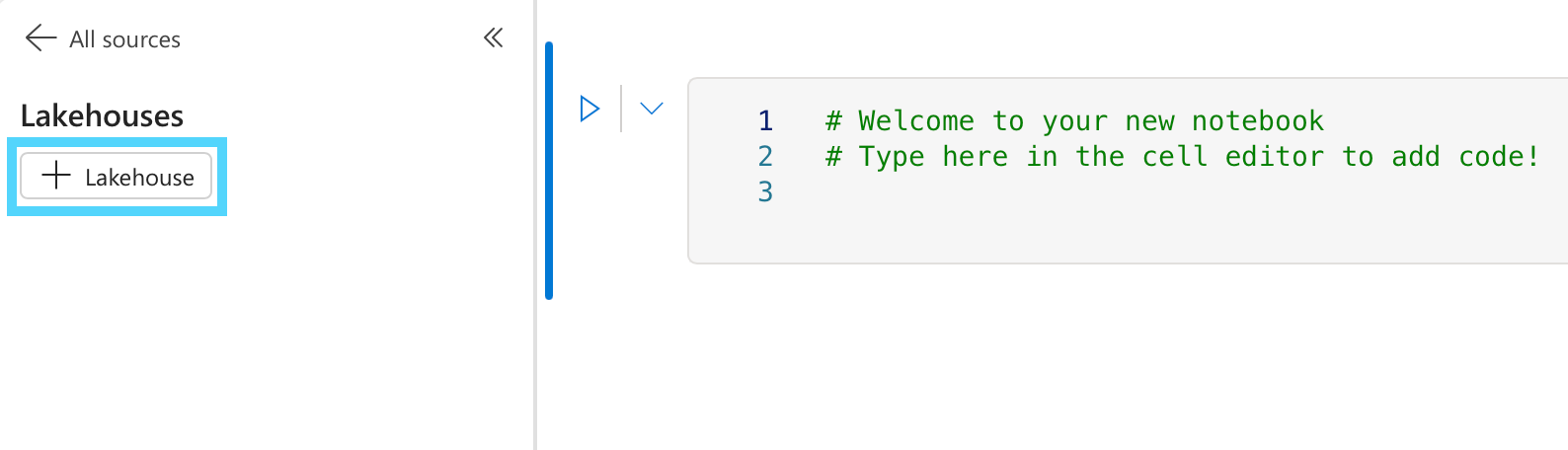Now, let's add the code cells to the notebook. We use PySpark for ingesting the raw data into the lakehouse.