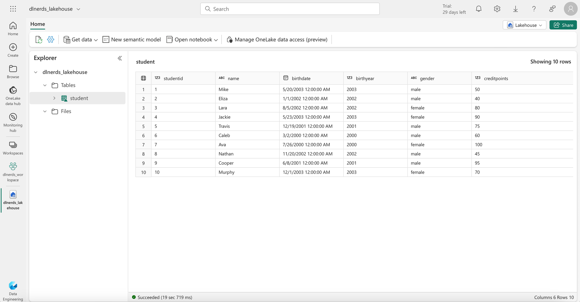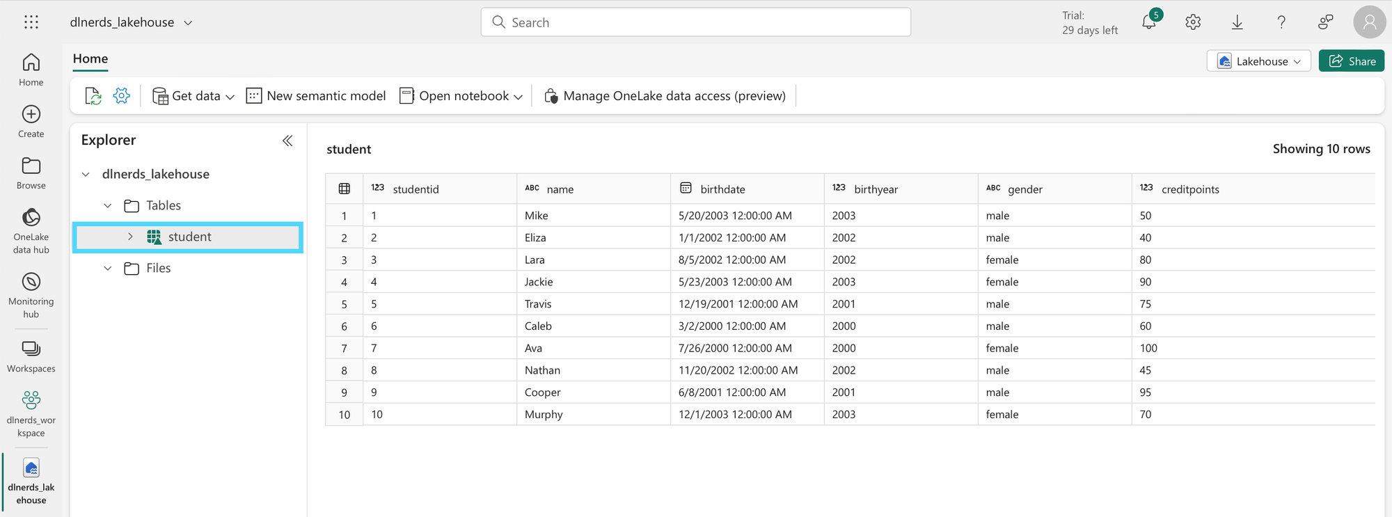 We consider the delta table student that is stored in the lakehouse "dlnerds_lakehouse".