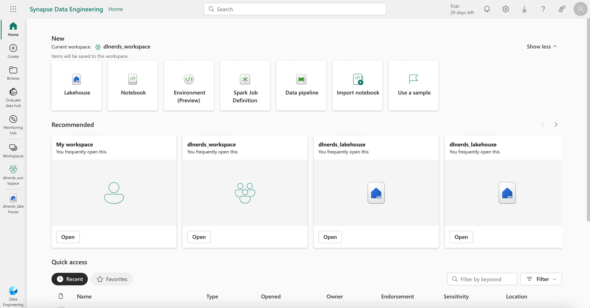 We have already signed in into Fabric and opened the Data Engineering Experience. We have selected the workspace "dlnerds_workspace".