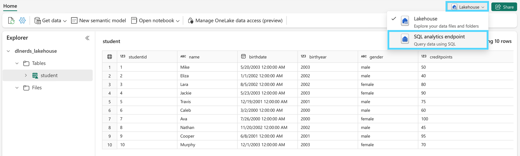 Open the lakehouse from which you want to query data. We open the lakehouse "dlnerds_lakehouse". The lakehouse contains the delta table "student".
