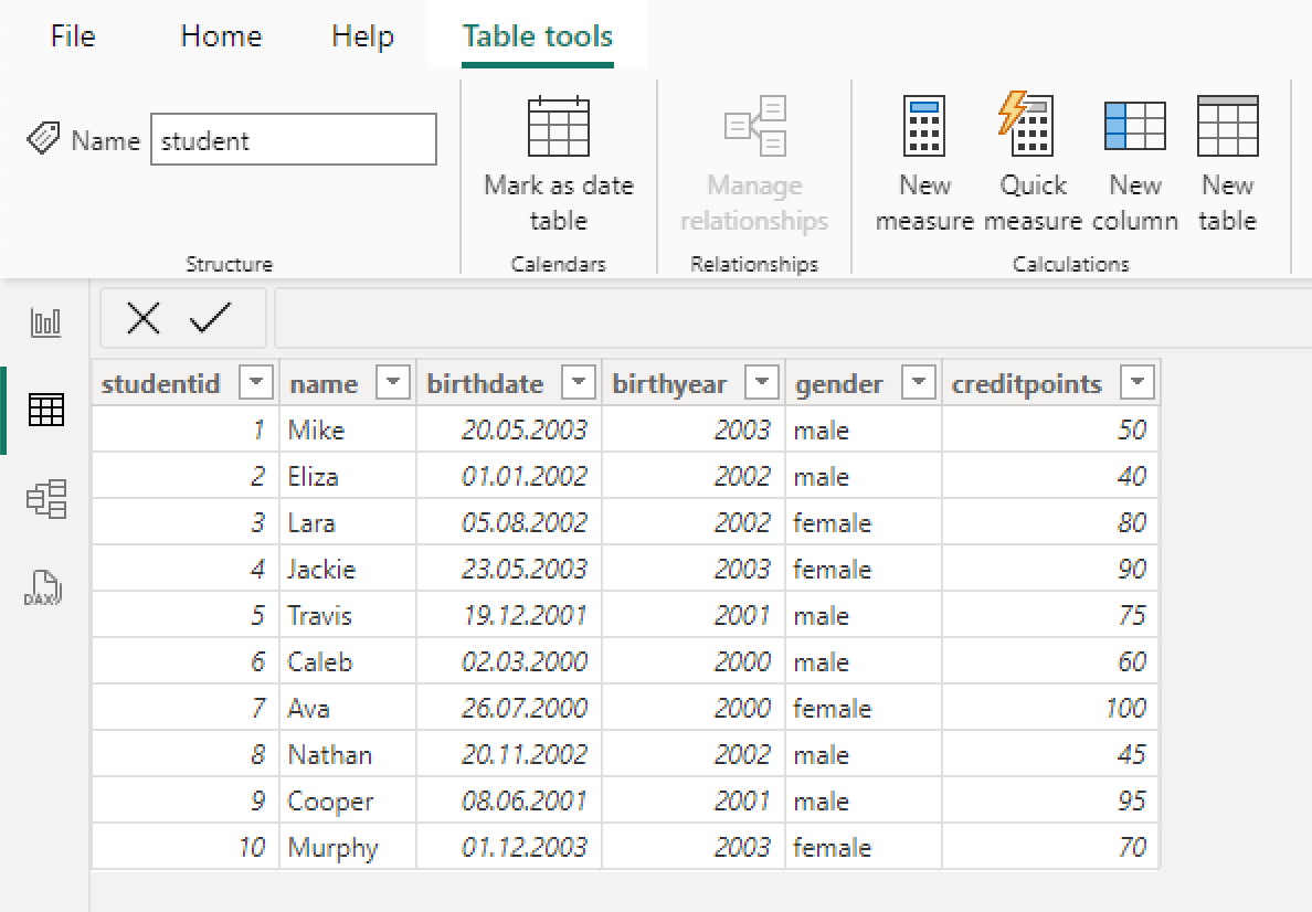 Introduction In this tutorial, we want to import Data from a Excel file into Power BI. This can be easily done in the Power BI Desktop interface. Data Source Our data source is the Excel file student. The file contains the following data: Power BI Desktop In the following, we