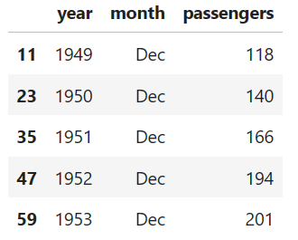 Let's analyze the number of passengers in December and how it has developed over the years. In order to do this, we filter the DataFrame by the month of December.