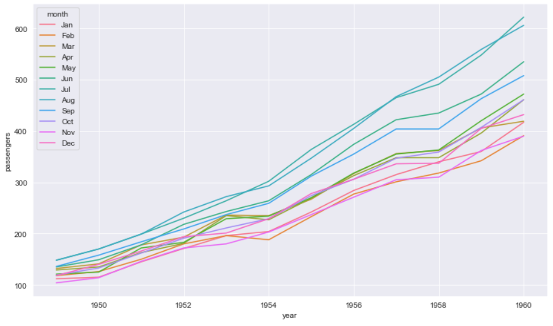 Let's analyze the development of the number of passengers for all months over the years. To do this, we consider our DataFrame without filters. The parameter "hue" specifies the grouping.