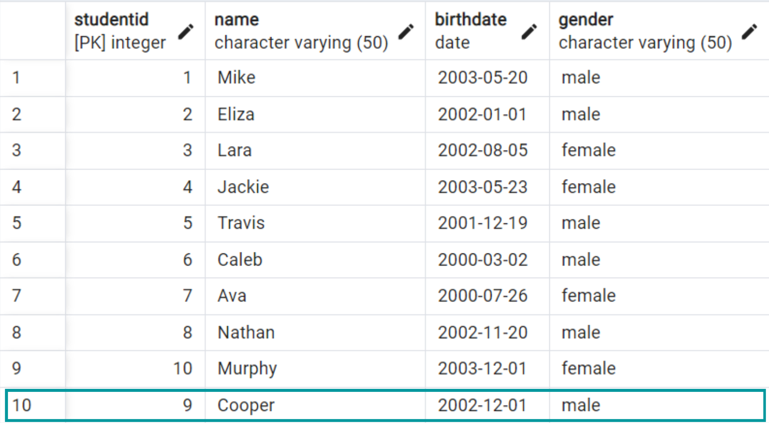 We want to update the student with the name Cooper. We change the birthdate from 2001-06-08 to 2002-12-01.