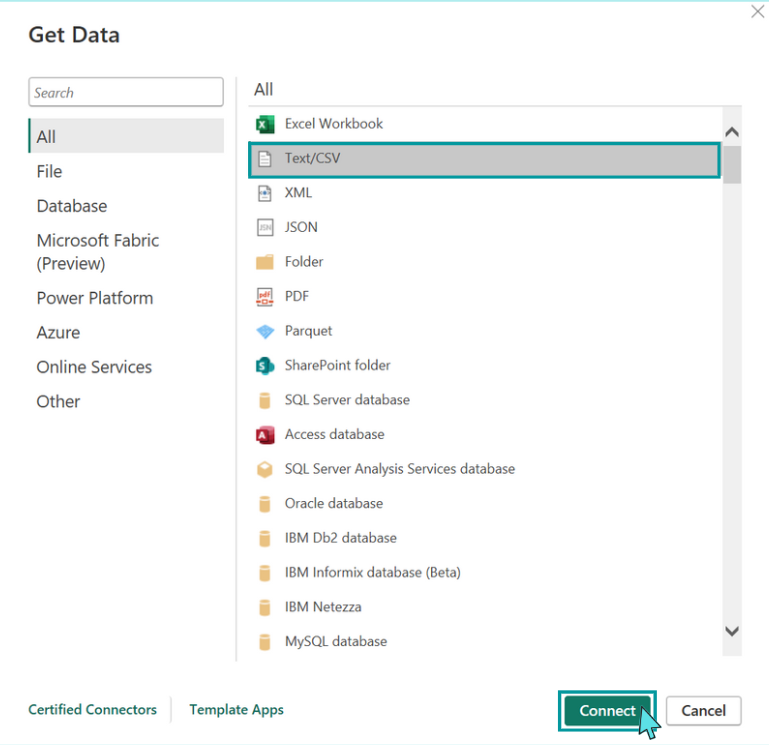 We get a selection of different data sources. We choose the data scource “Text/CSV” and click “Connect”.