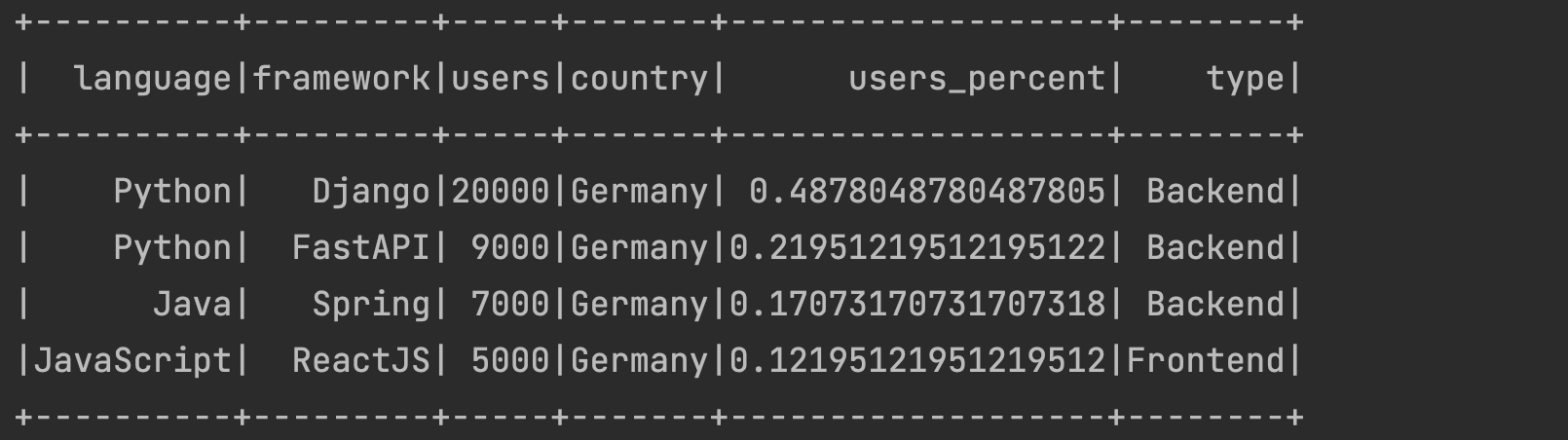 Next, we would like to add the column "type" with the values "Backend", "Frontend" and None depending on the values of column "language".
