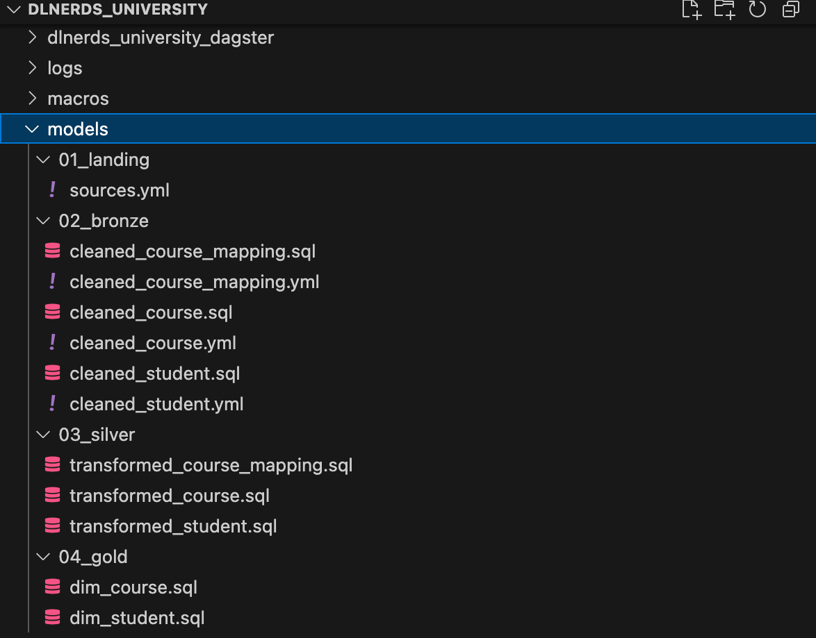 In this tutorial, we’re working with a dbt project called dlnerds_university. The project contains several dbt models and a Dagster project named dlnerds_university_dagster.