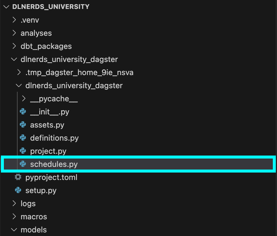 Navigate to your Dagster project folder and open schedules.py. This is where we’ll define when dbt models should run.