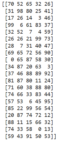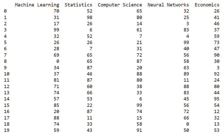 exam_result = np.random.randint(100, size=(20,5))