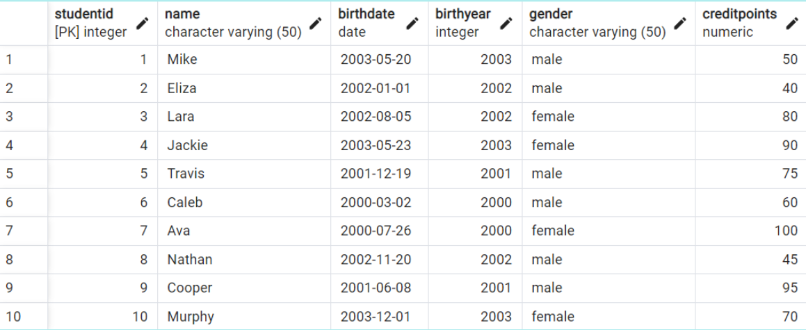 In this database we have created the table student that contains the following data: