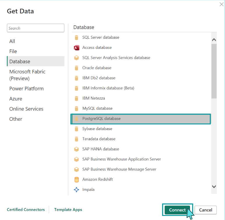 We get a selection of different data sources. We choose the data scource “PostgreSQL database” and click “Connect”.