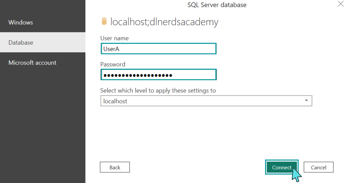 Next, we enter the credentials of a user who has access to the data source.