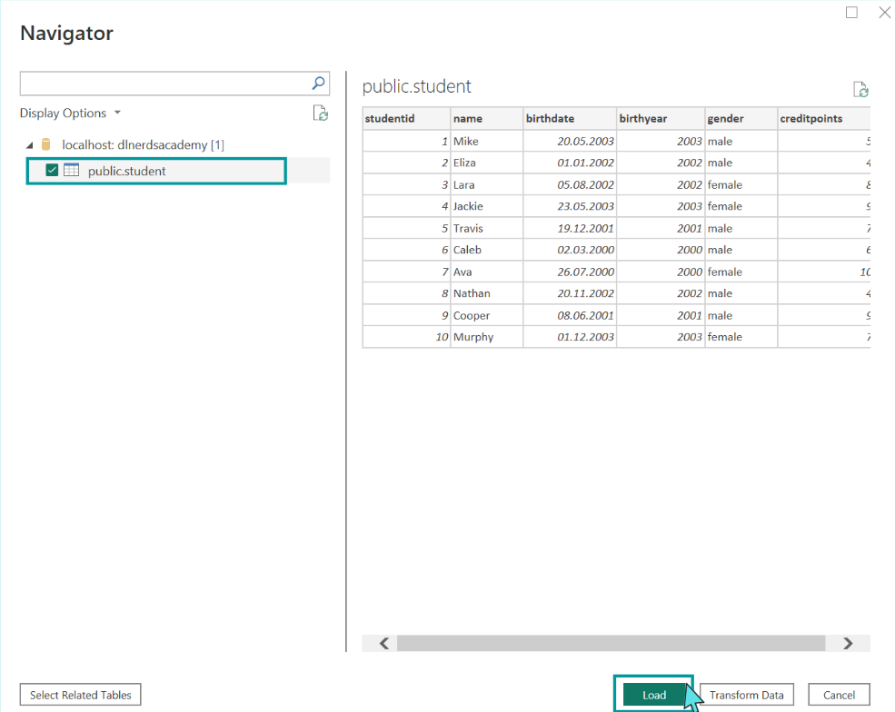 Now, we get a preview of the data. We select the table student. Since we do not want to make any transformations on the data, we click directly on “Load”.