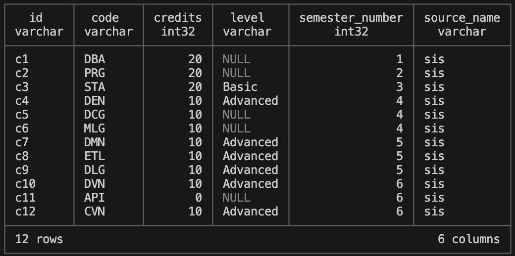 Let's consider the model cleaned_course. The table in the warehouse contains the following data: